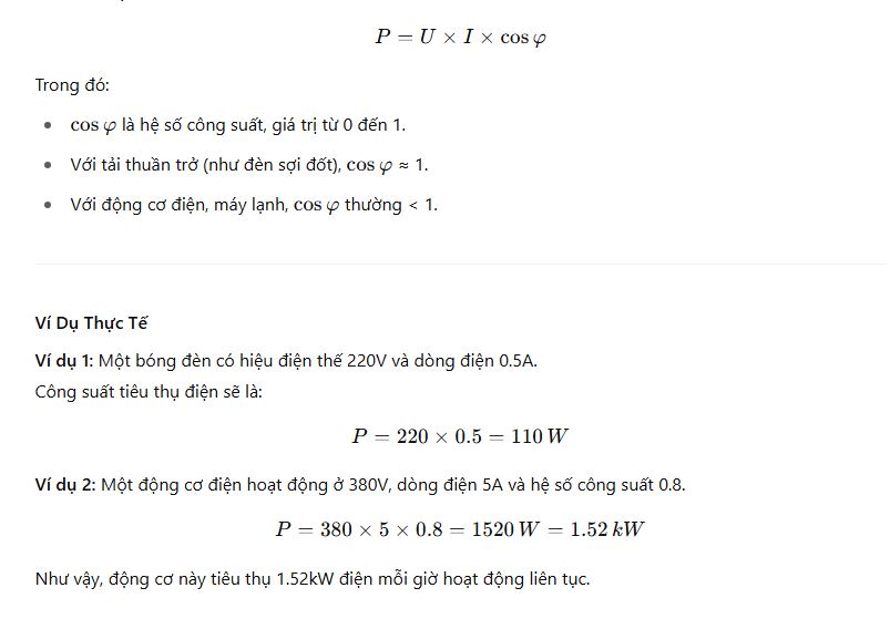 Nếu thiết bị là tải điện xoay chiều, công suất thực tế tiêu thụ còn phụ thuộc vào hệ số công suất (Power Factor – PF):